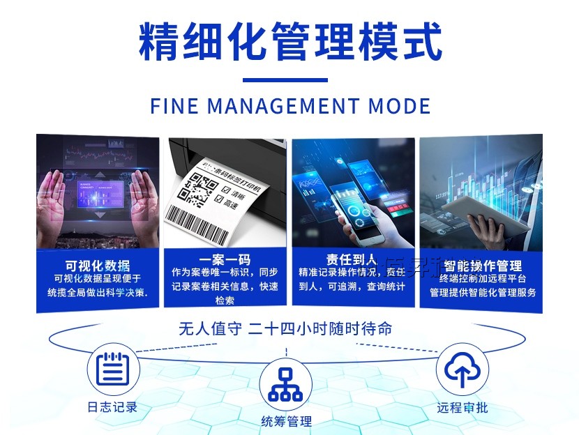 智能档案管理柜内置强大的档案管理系统,能够对档案进行自动分类、编号和存储。系统支持多种档案格式,包括纸质档案、电子文档、图片、视频等,并能够自动更新档案信息,确保档案数据的实时性和准确性。此外,系统还提供档案借阅、归还、销毁等全流程管理功能,实现档案管理的全面数字化。