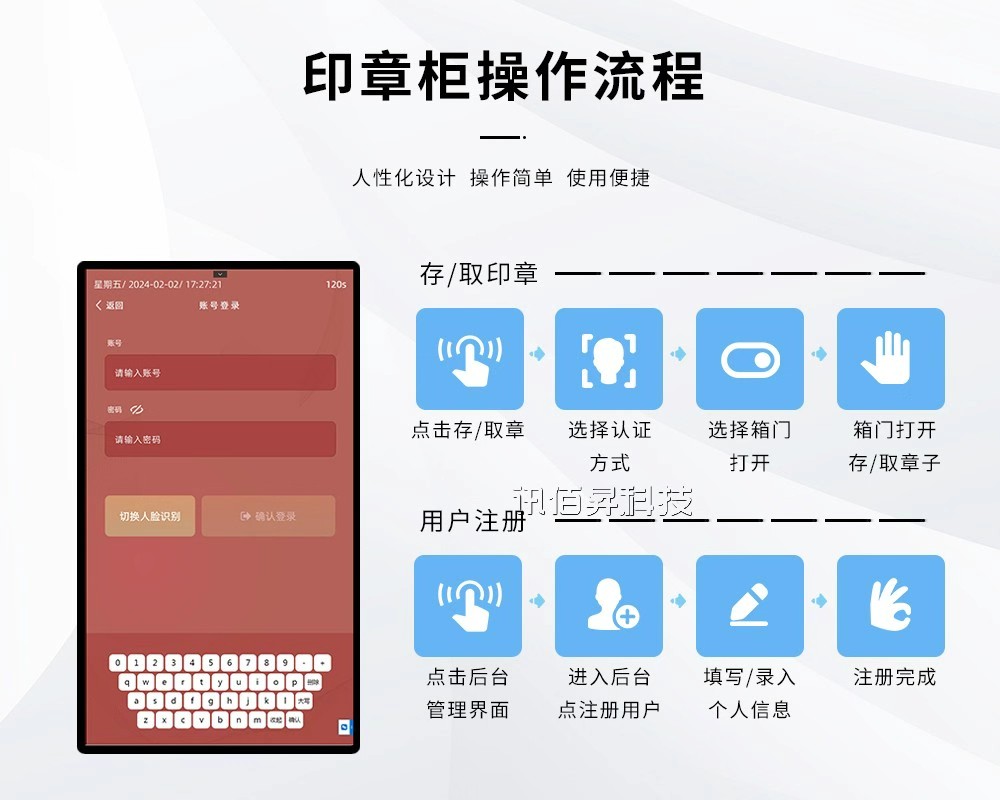 身份识别系统:支持指纹、人脸识别、密码或IC卡等多重验证,确保仅授权人员可操作。例如,某金融企业通过指纹锁将印章误用率降低92%。